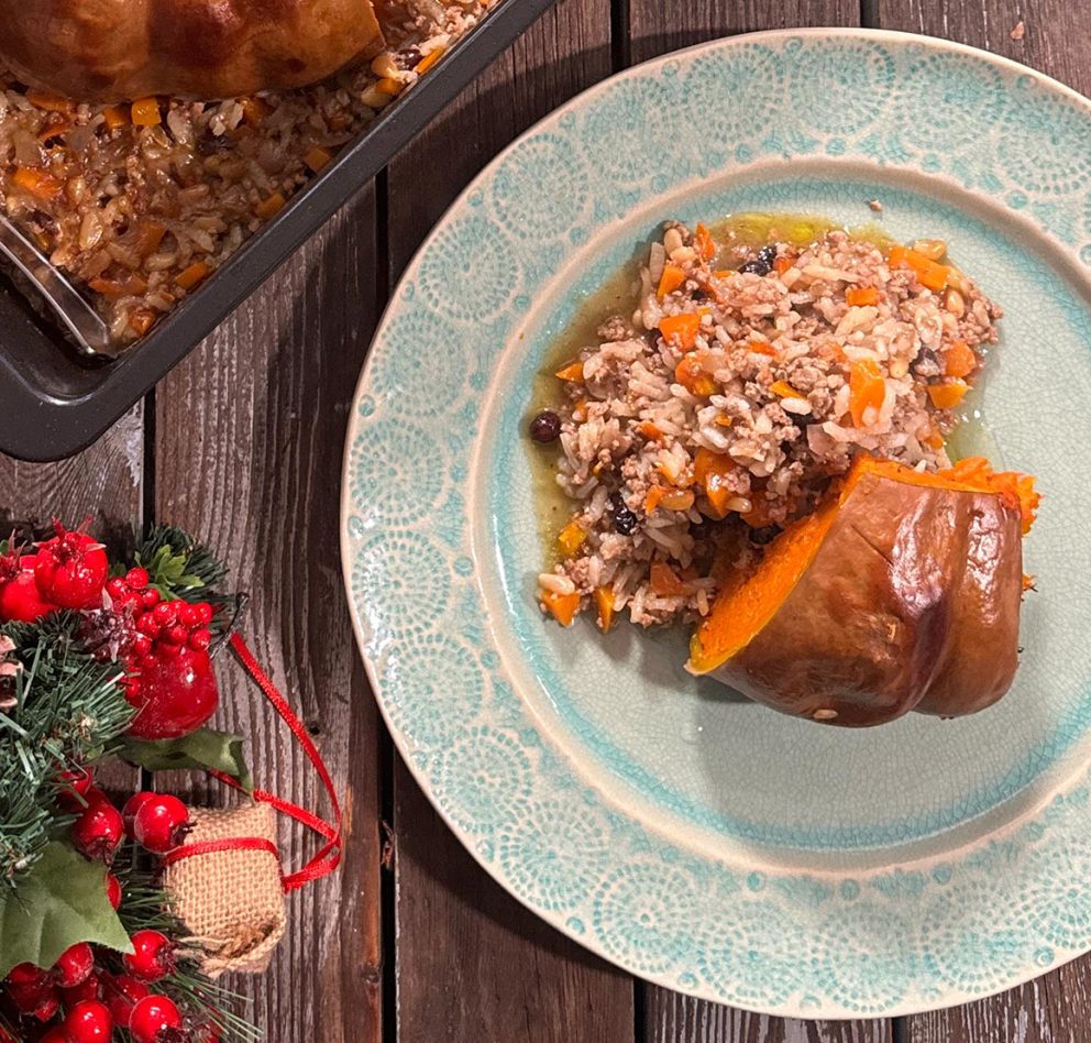 In the past, this sweet-savory filling — rice, minced meat, raisins, pine nuts, spices — was used to stuff whole chicken or lamb for special occasions. Today, it makes the perfect filling for a whole roasted pumpkin, creating a warm, aromatic centerpiece for the holiday table.