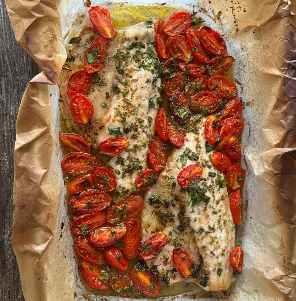 There’s something unmistakably Greek about the combination of fresh fish, ripe tomatoes, and fragrant herbs. This dish captures that Aegean feeling — light, clean flavors that come together with almost no effort. Cooking the fish in parchment (or foil) keeps it incredibly moist while allowing the tomatoes to release their juices, creating a naturally flavorful sauce infused with oregano, garlic, and good olive oil. It’s the kind of recipe you can prepare on a busy weeknight but also elegant enough to serve to guests with a chilled glass of white wine.
